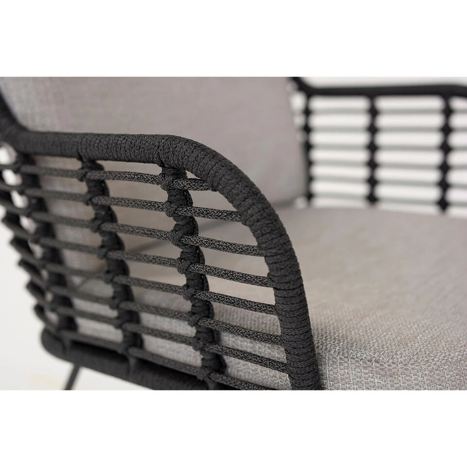 Ben je op zoek naar een mooie tuinstoel met een afwerking van touw? Bekijk dan eens de prachtige Fabrice tuinstoel met donker grijs kleurig touw. Lounge dining stoel Fabrice is gemaakt van rope. Het rope geeft de stoel een speelse uitstraling wat goed combineert met hout of aluminium. Het sterke frame van de Fabrice tuinstoel is gemaakt van RVS met een grijze poedercoating. Daar omheen zit rope wat speciaal is ontworpen voor buitengebruik. Rope heeft een buitenlaag van Olefin en de binnenlaag is gemaakt van polypropyleen. Deze materialen zorgen ervoor dat het schimmelwerend en water- en vuilafstotend is. Daarbij heeft het rope ook een hoge UV bescherming waardoor de stof niet warm wordt in de zon. Wel zo prettig op een mooie zonnige dag! Afmeting tuinstoel: 60 x 61 x 80 cm.