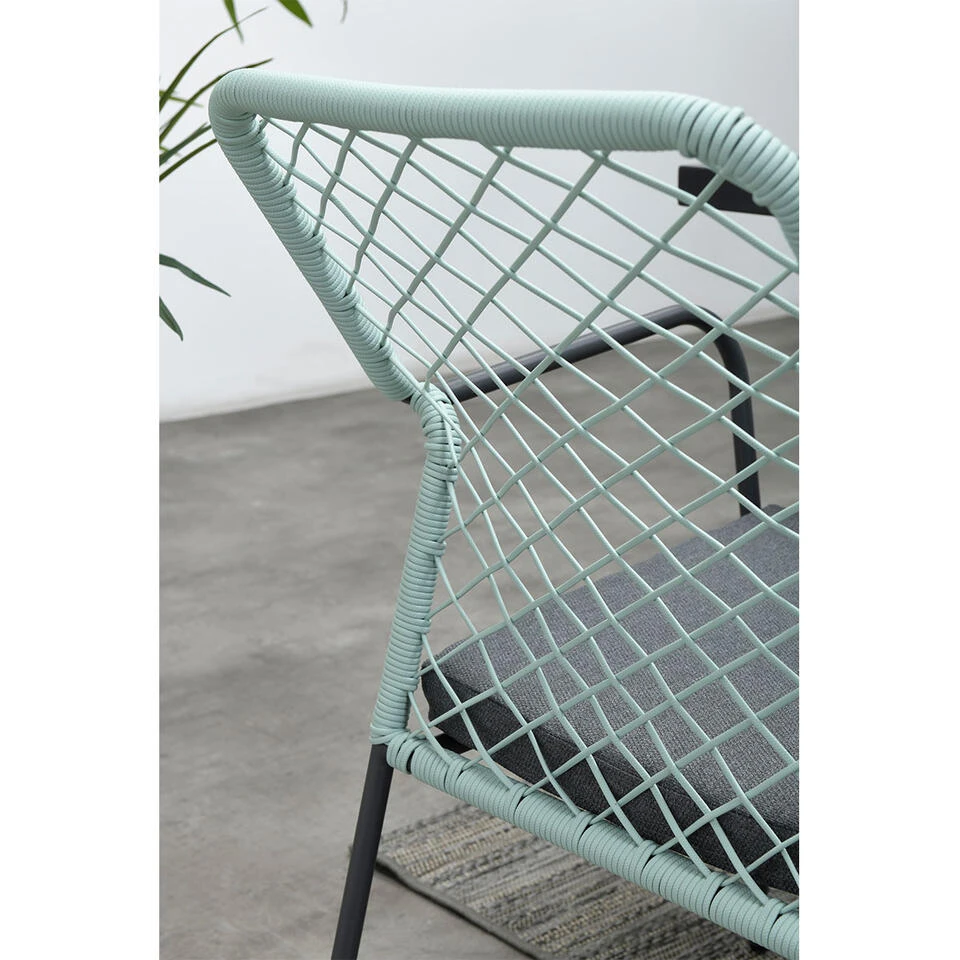 De Ross tuinstoel is vervaardigd uit een onderhoudsvrij aluminium frame met een stevige poedercoating. Om dit stevige aluminium frame zit 5 mm dik hoogwaardige kwaliteit touw. Dit touw heeft een zacht groene kleur en is te vergelijken met touw dat in de scheepsvaart gebruikt wordt. Het touw is voorzien van een rubberen kern binnenin met daarin meerdere polyester draden voor de stevigheid. Om de rubberen kern zit solution dyed polyester rope. Dit betekent dat het touw door en door gekleurd is en verkleurt veel minder snel.