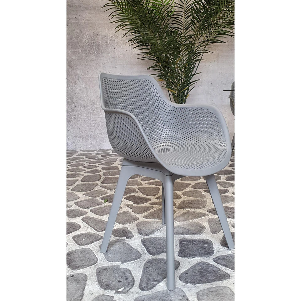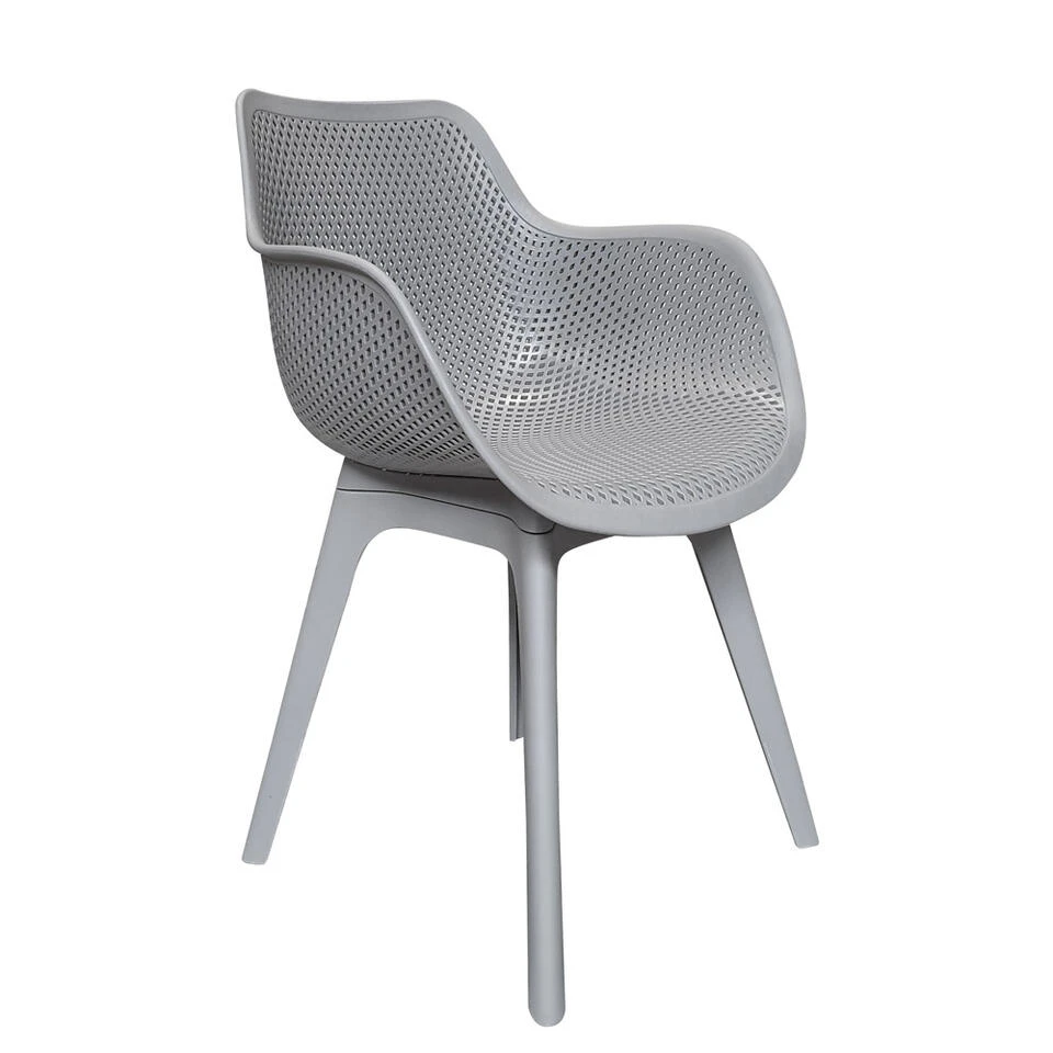 Deze tuinstoel van kunststof is volledig onderhoudsvrij en kan het hele jaar door buiten blijven staan. De kuipvormige zitting is comfortabel en dankzij de perforatie ook luchtig op warme dagen.